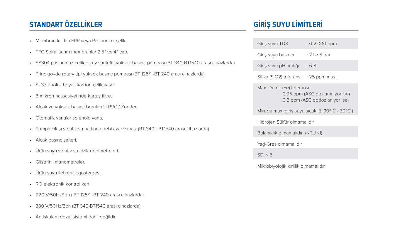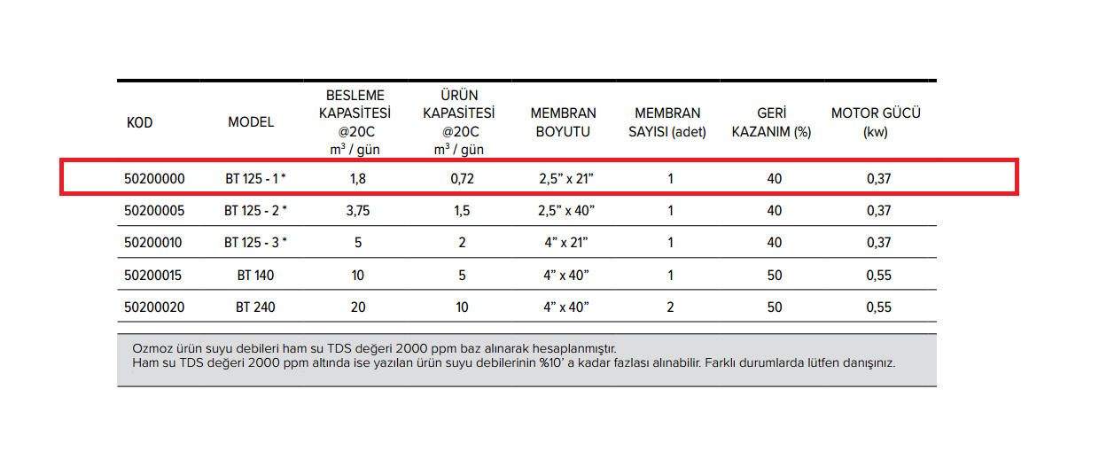 Ozmoz ürün suyu debileri giriş suyu TDS değeri 2000 ppm baz alınarak hesaplanmıştır. Ham su (giriş suyu) TDS değeri 2000 ppm altında ise yazılan ürün suyu debilerinin%10’a kadar fazlası alınabilir.