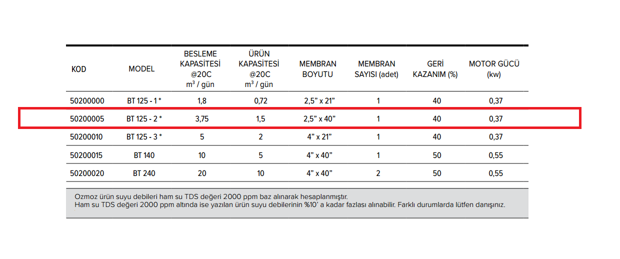 Ozmoz ürün suyu debileri giriş suyu TDS değeri 2000 ppm baz alınarak hesaplanmıştır. Ham su (giriş suyu) TDS değeri 2000 ppm altında ise yazılan ürün suyu debilerinin%10’a kadar fazlası alınabilir.