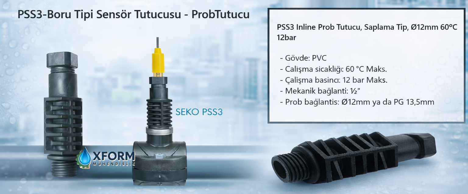 PSS3 – Boru Tipi Sensör Tutucusu (Probtutucu), su ve proses sistemlerinde pH, ORP, iletkenlik gibi sensörlerin boru hattına güvenli ve doğru şekilde montajını sağlayan bir tutucudur.