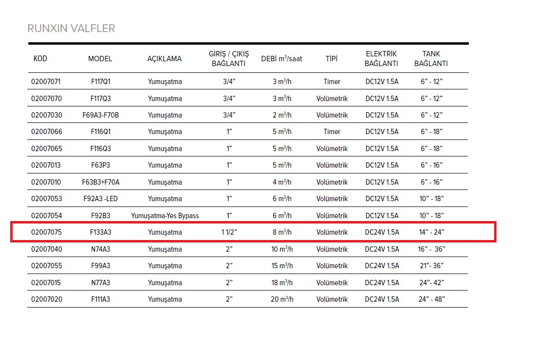 | Runxin F133A3 Yumuşatma Valfi Teknik Verileri | |