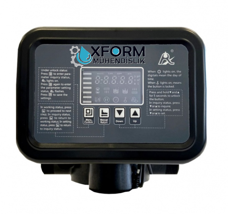 Dinamik ekrandaki animasyon, valfin servis veya rejenerasyon çevriminde olduğunu net biçimde gösterir. 1 dakika işlem yapılmadığında tuş kilidi devreye girerek yanlışlıkla parametre değişimini önler.