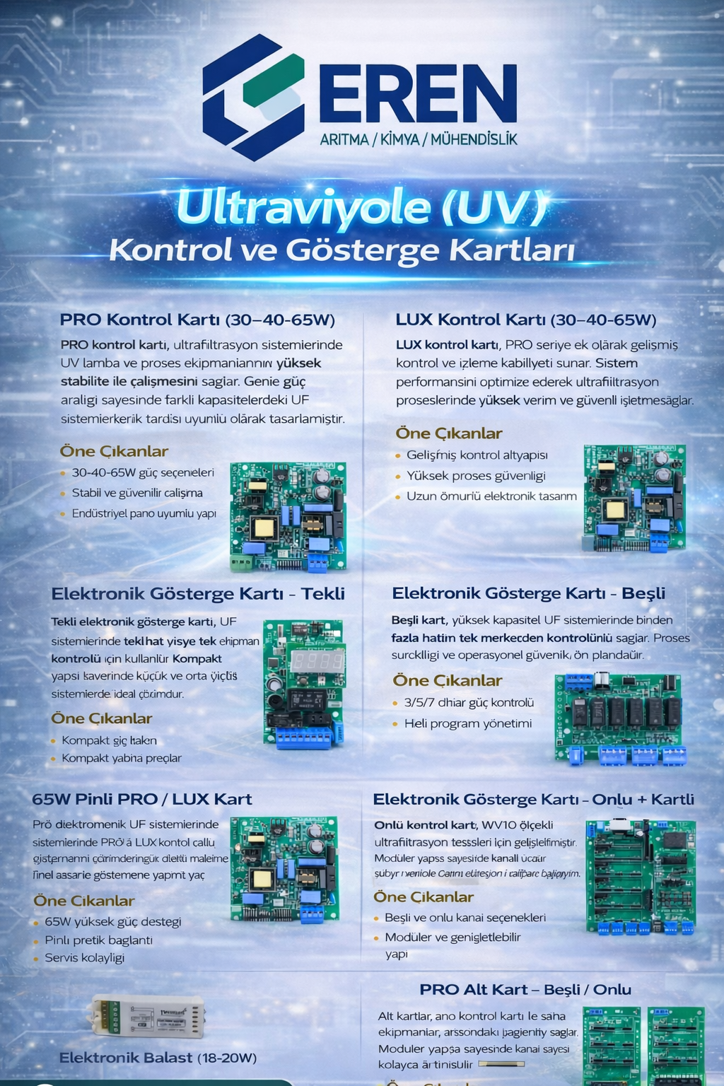 Ultraviyole (UV) Kontrol ve Gösterge Kartları, UV dezenfeksiyon sistemlerinde kullanılan kontrol elektroniği ve gösterge modülleridir.