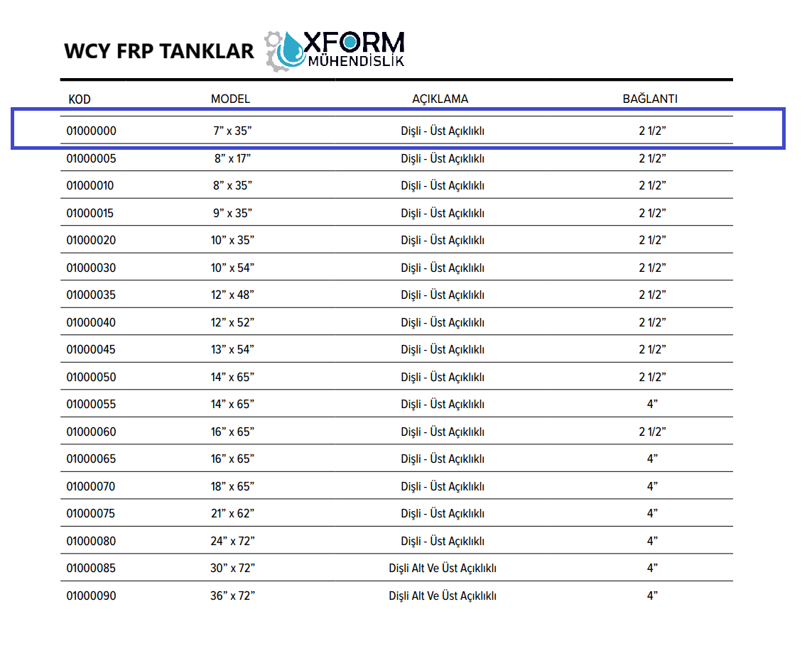 WCY FRP mineral tankları, su arıtma sistemlerinde, 18 cm (7”) ve 160 cm (63”) çap aralığında kullanılmaktadır. WCY Marka FRP mineral tankları, polietilen kılıf üzerine fiber katkılı polyester elyaf sarılarak imal edilmektedir. FRP tanklarda basınca karşı dayanım sağlayan dış yüzeydeki fiber sarımdır. FRP tanklar, pozitif basınca karşı dayanıklı iken, vakuma karşı dayanıklı tanklar değildir. Bu nedenle, FRP tank uygulamalarında mutlaka vakum kırıcı uygulanmalıdır. FRP tanklarda alt dağıtım yapısı olarak ahtapot lateral difüzörler kullanılmaktadır.
